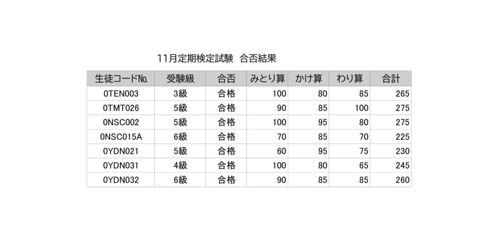 【北区・中央区5教室】2025年11月珠算検定試験結果