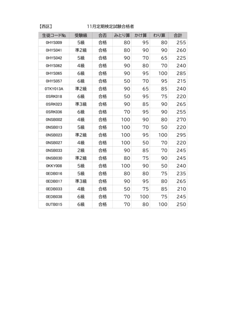 【西区7教室】2025年11月珠算検定試験結果